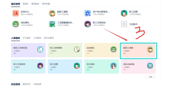 进入以下页面,在“人事服务”栏目中选择“教职工请假”