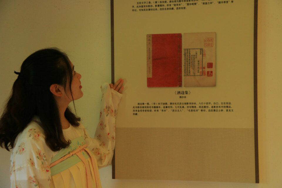 负责展厅讲解的团队成员,在省古籍保护中心办公室乔主任的指导下,查阅相关知识,按照古籍保护中心展厅的陈列顺序,身着一袭汉服,对读者进行“古籍史基础展陈”讲解。